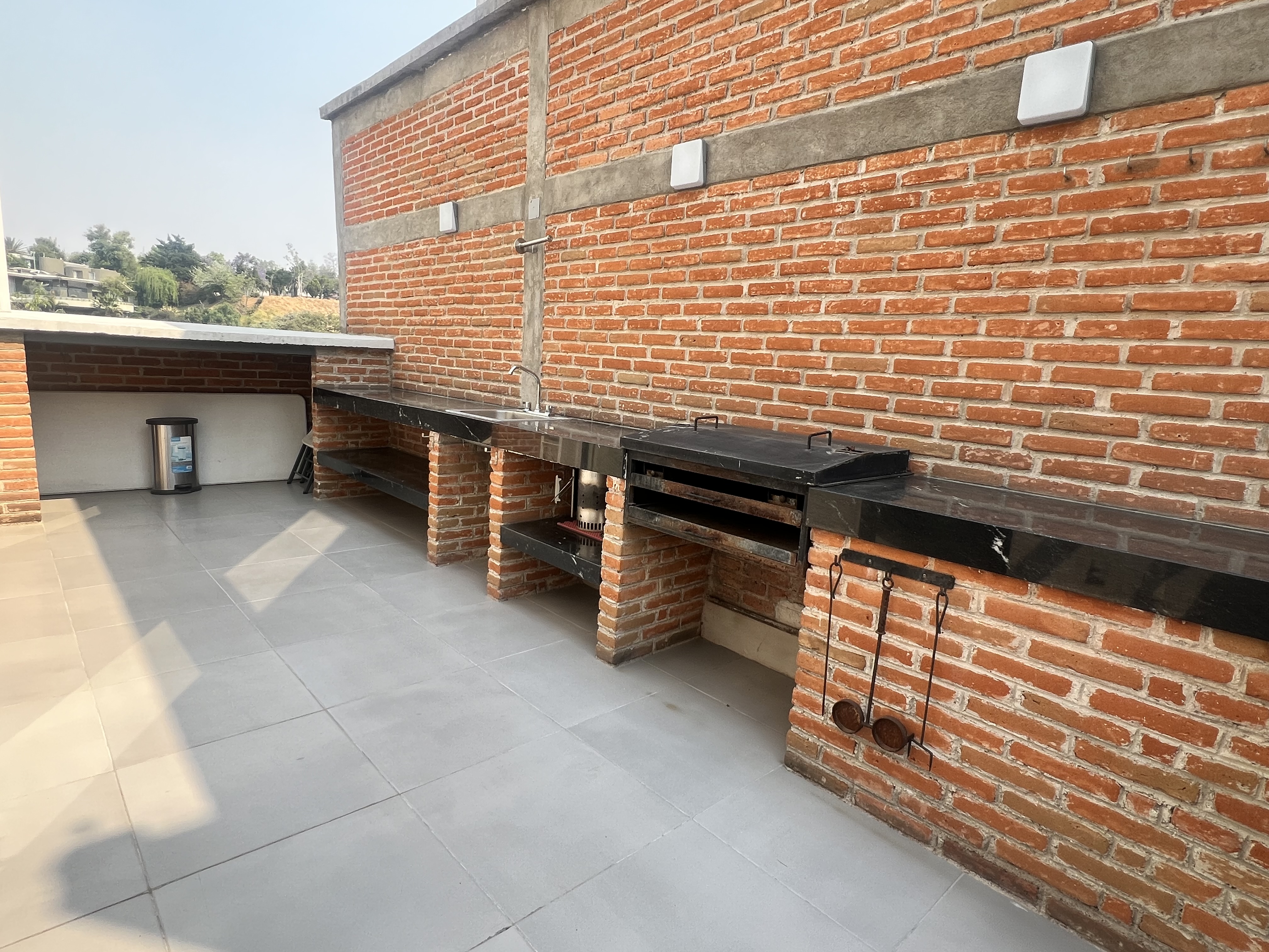 Terraza con barra de granito y asador.