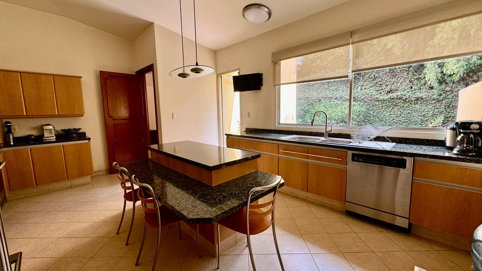 Domos con luz natural, comedor de gran amplitud, cocina equipada de gran tamaño, con cubierta de granito.