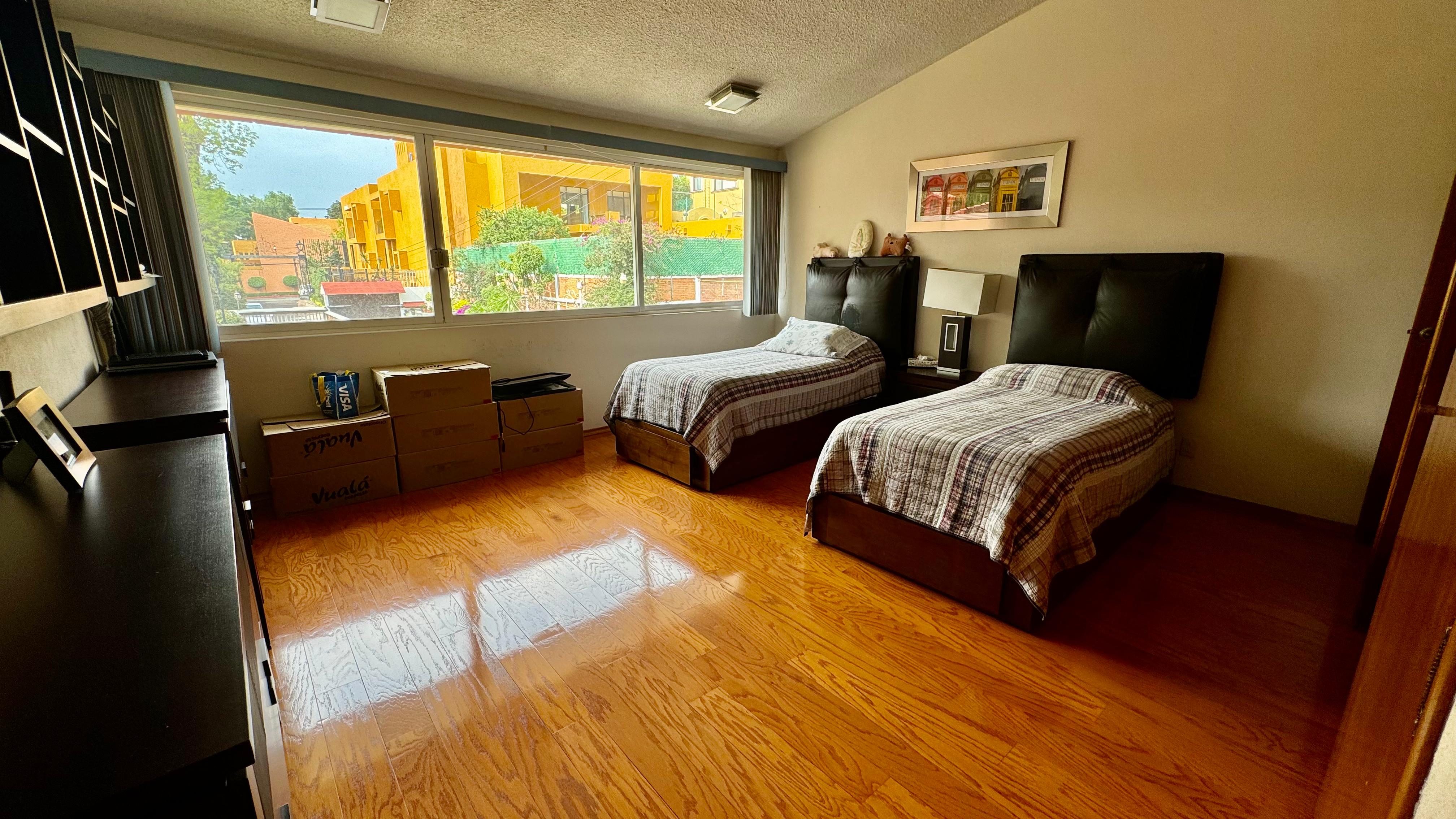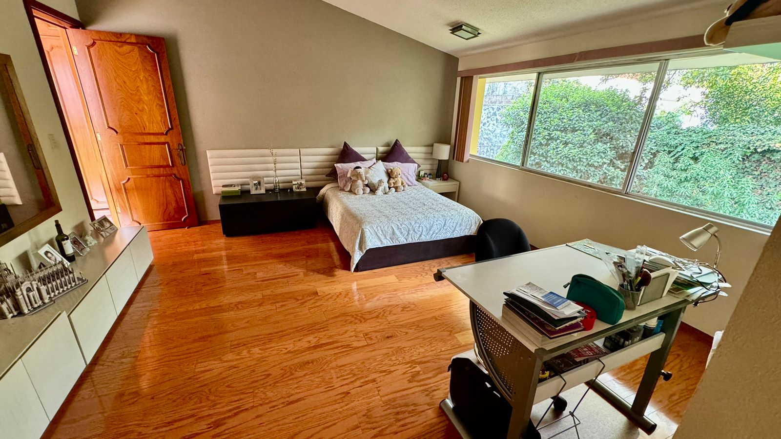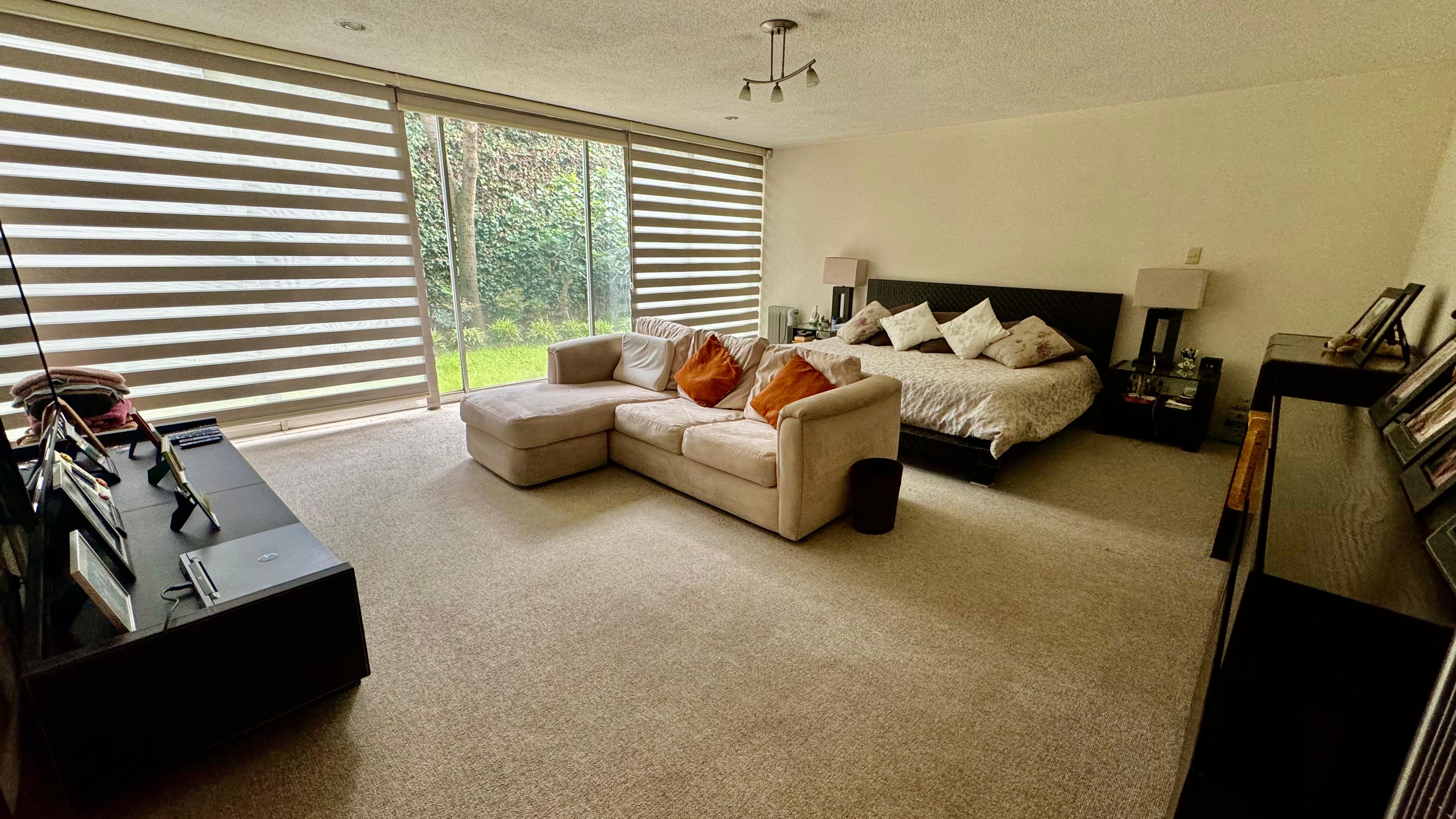 La recámara principal mide aproximadamente 45 m, tiene vista hacia el jardín y gran vestidor.