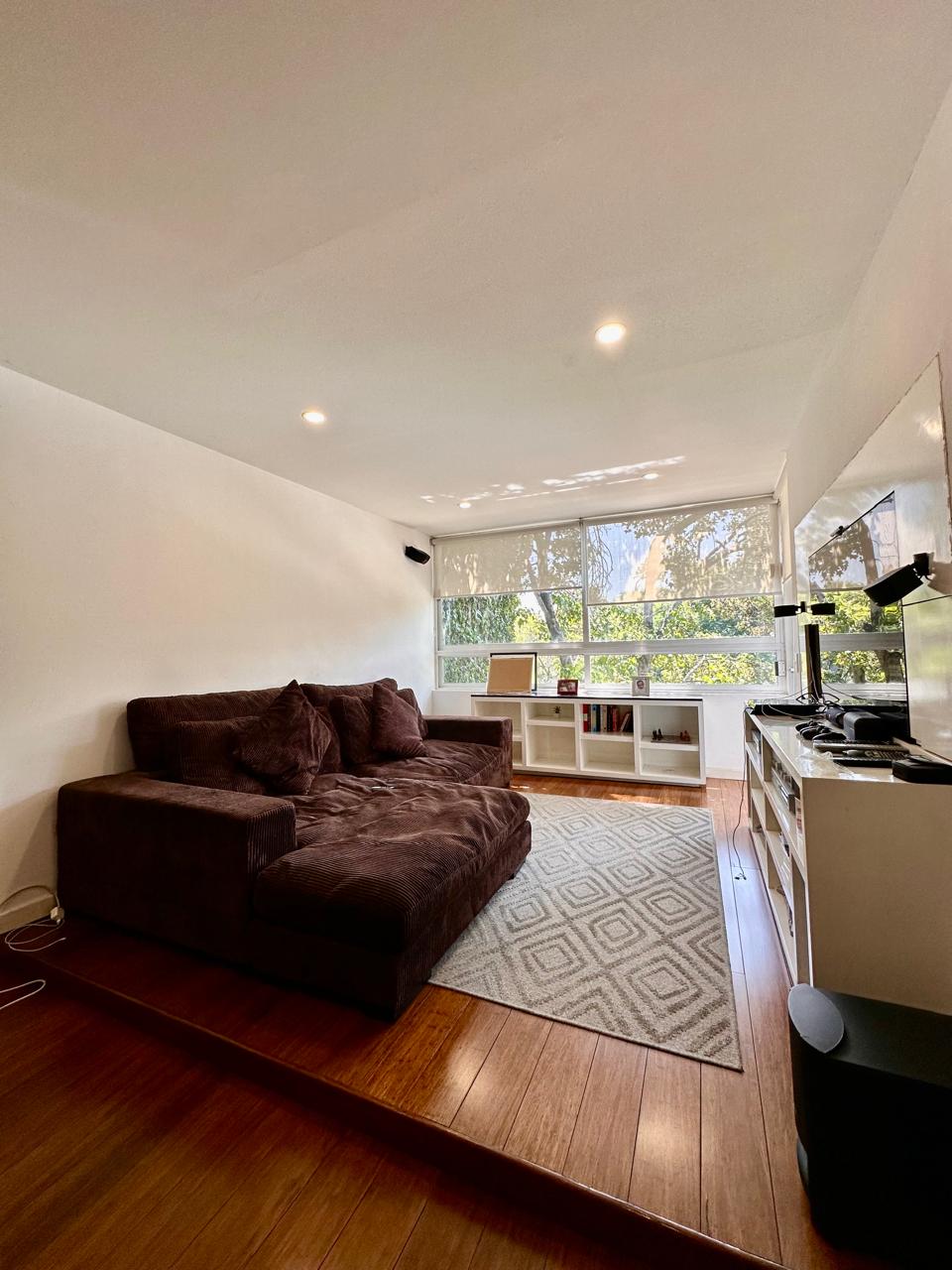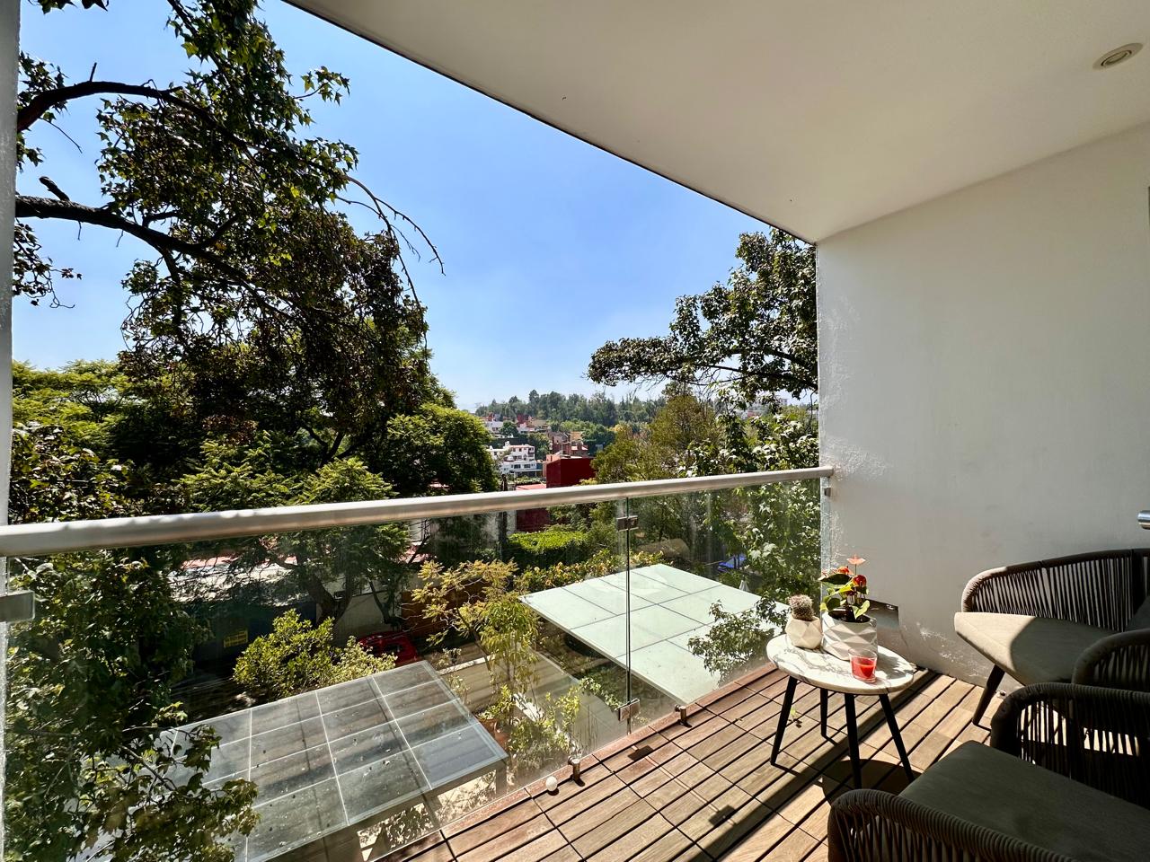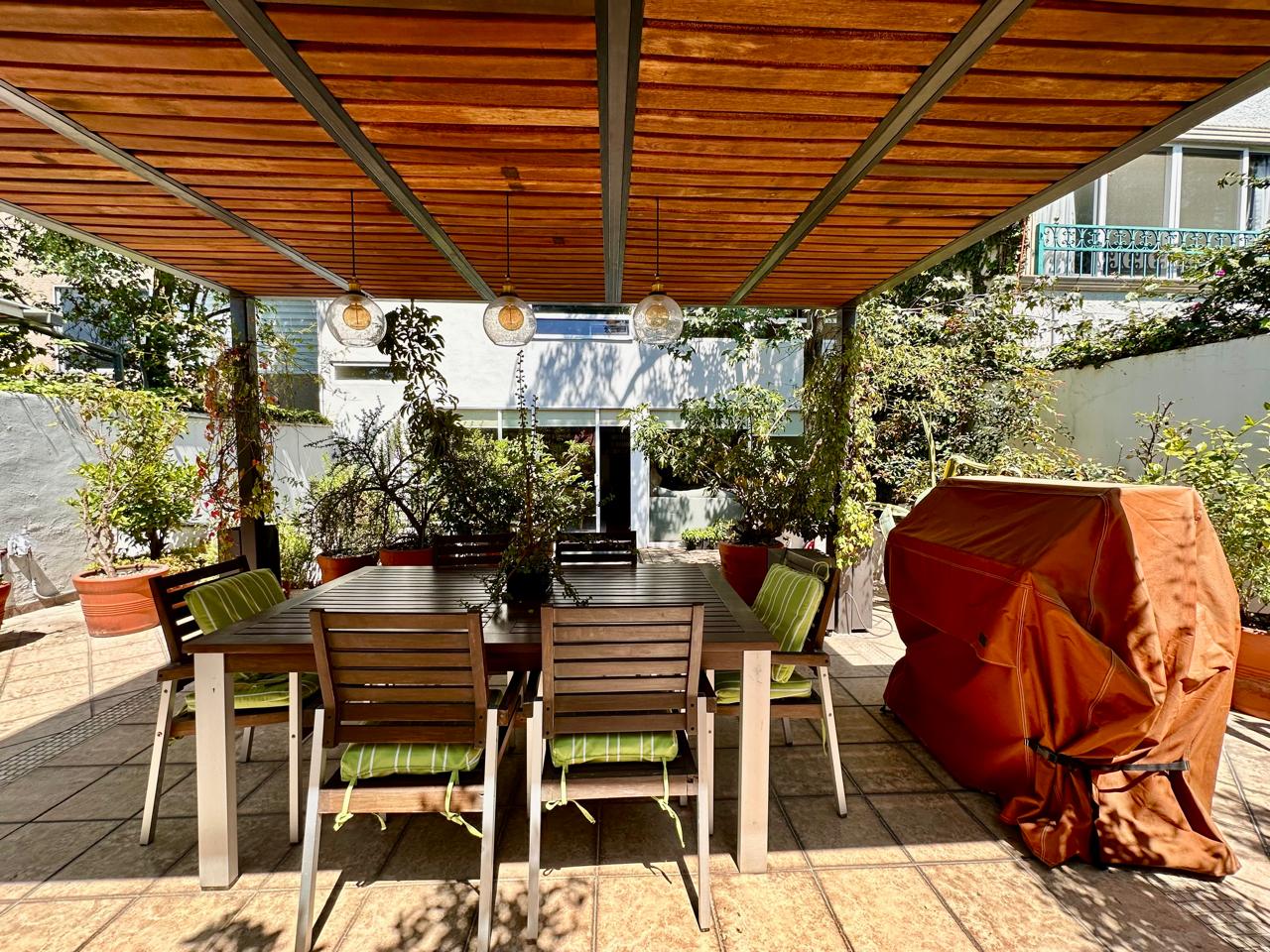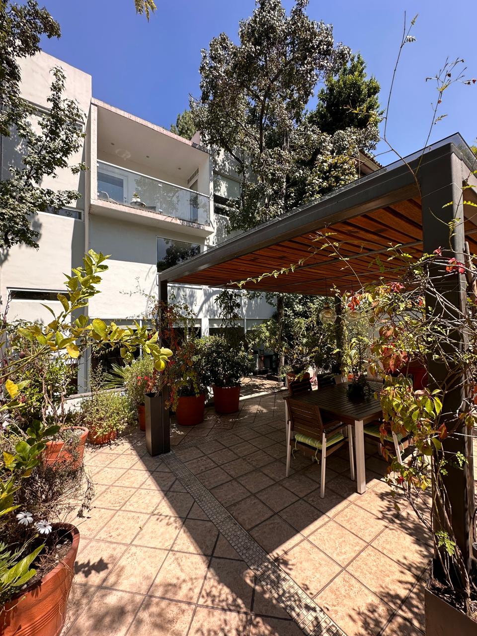 Estancia Sala comedor con pisos de madera, luz natural y salida a una hermosa terraza de 50 m2 aproximadamente, con pérgola, espacio para asador y una linda vista arbolada, donde podrás recibir a tus familiares y amigos.