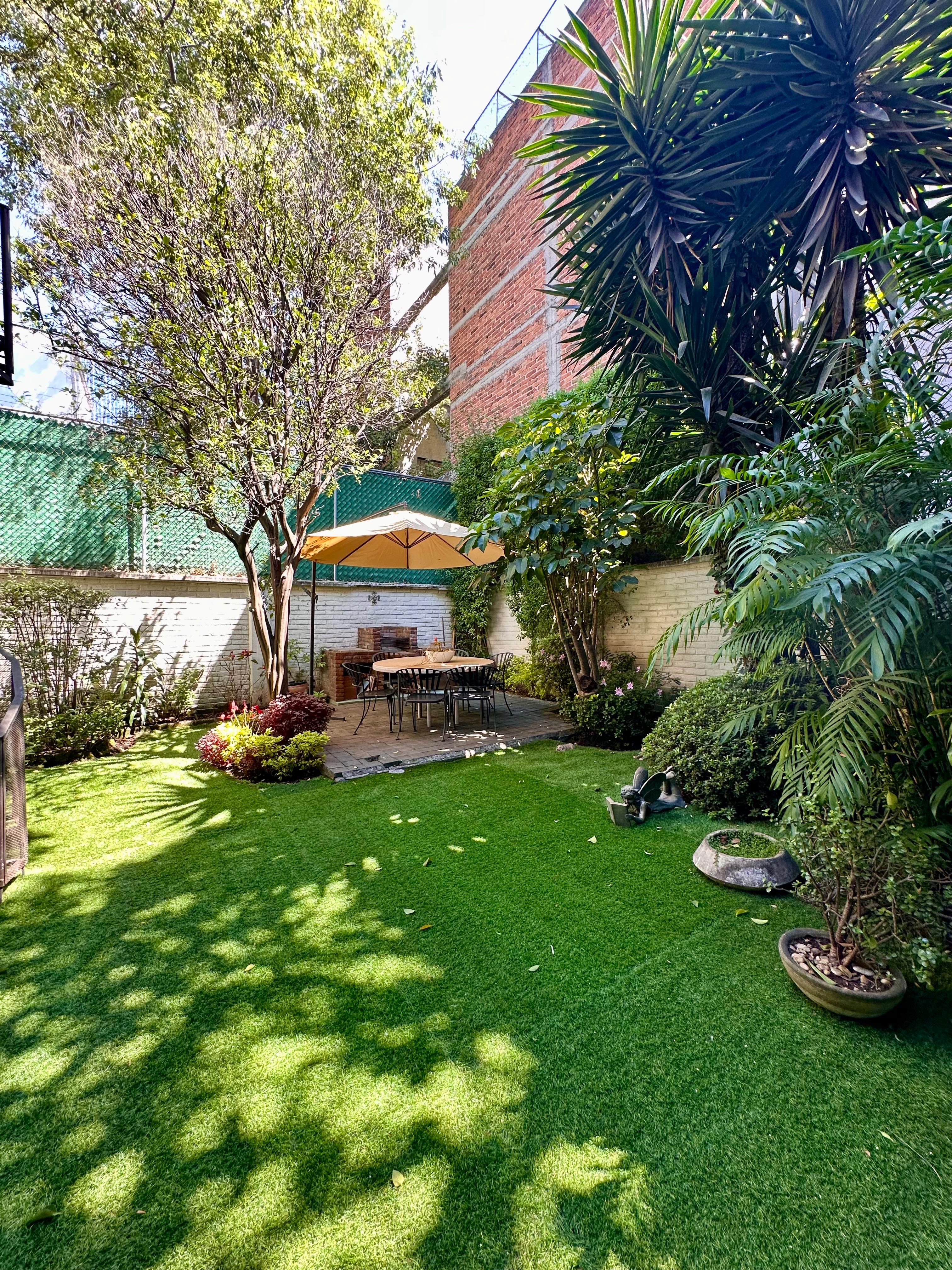 En el jardín una pequeña terraza con asador.