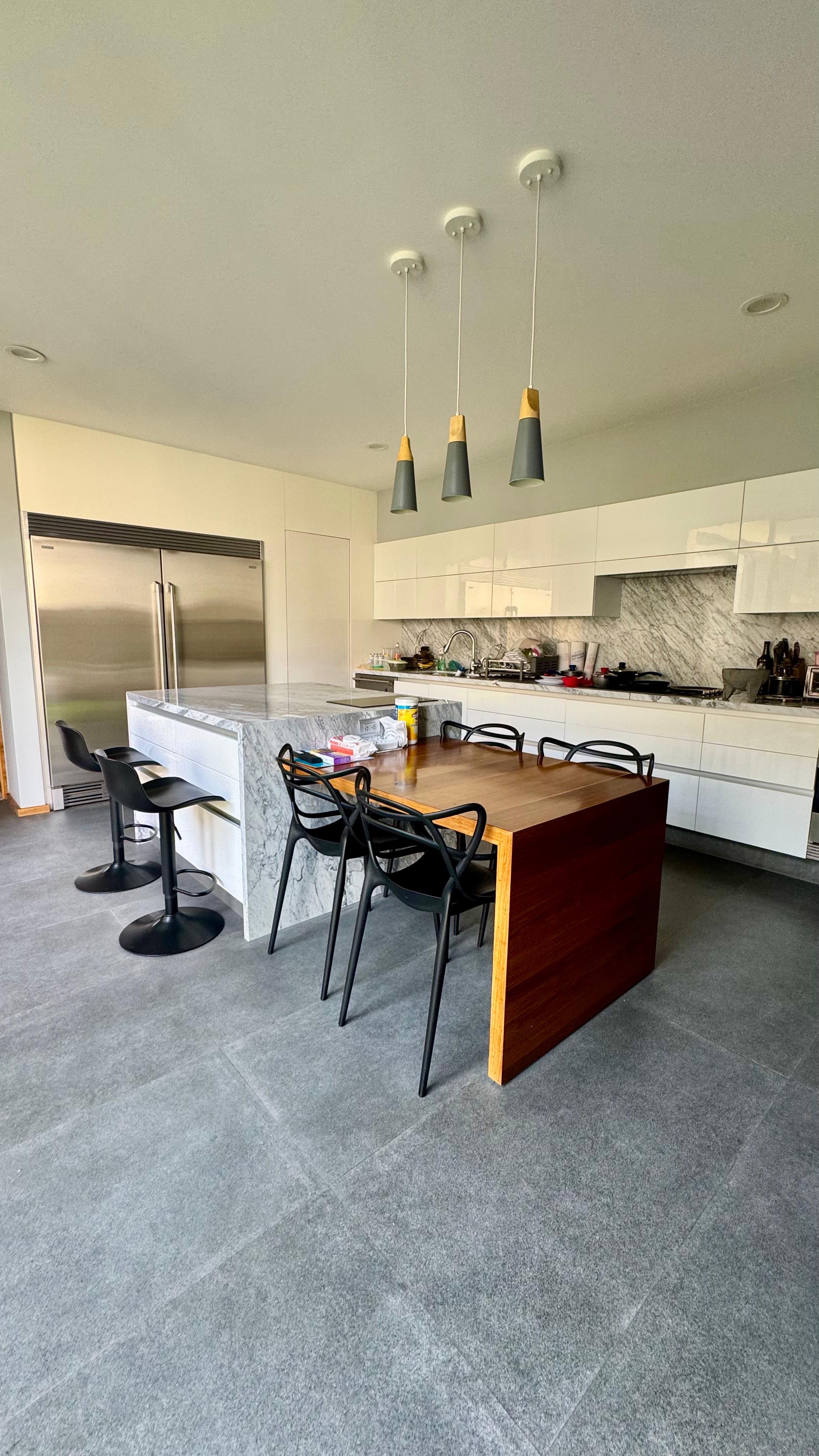 Cocina de mazu con cubiertas de granito negro flameado, con isla totalmente equipada con parrilla, campana, lavaplatos, horno de gas, horno de microondas, cafetera, dos conjuntos de refrigerador y congelador toso de la marca SMEG, además de contar con un cuarto de despensa y salida independiente al área de servicio.