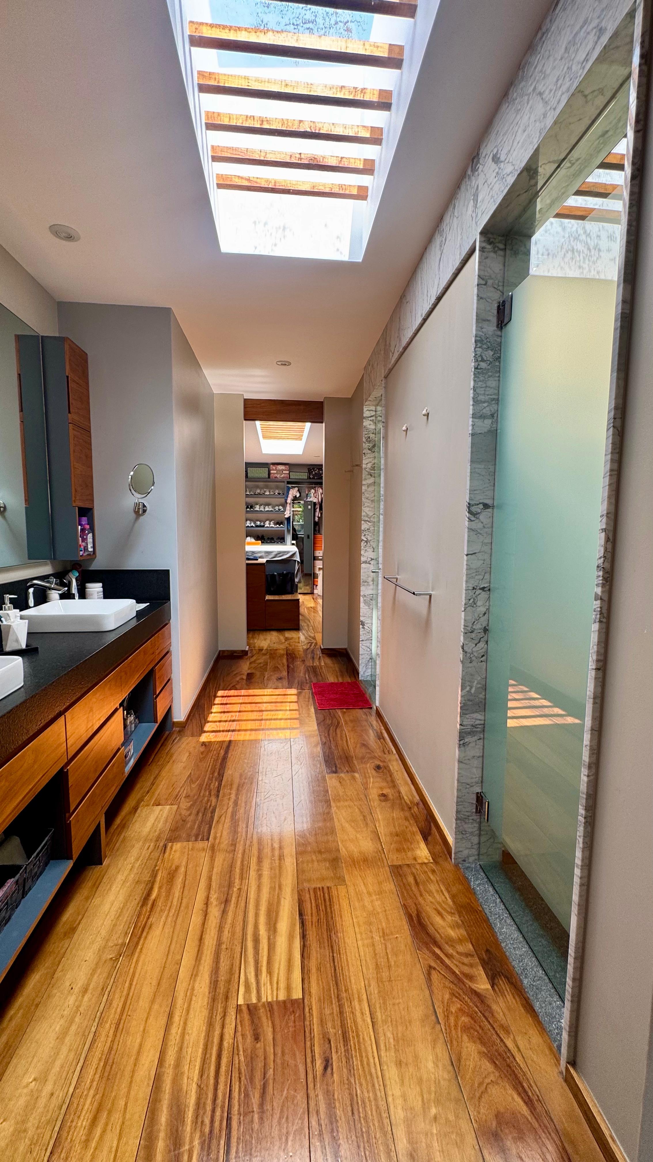 Recámara principal con vista al jardín, baño con doble lavabo, vestidor de gran tamaño con isla al centro.