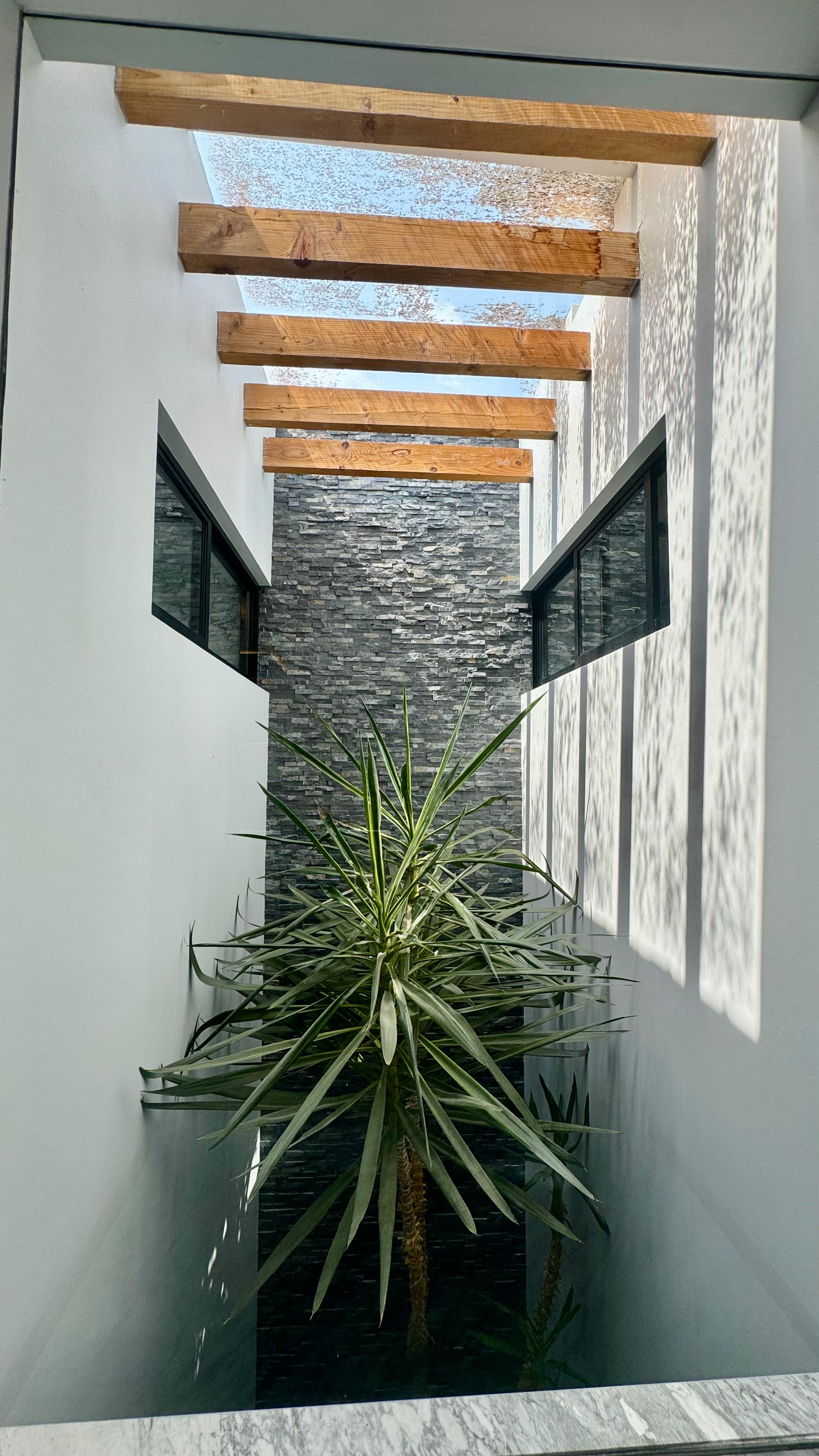 Sala de doble altura y comedor con una vista a su espectacular jardín interior.