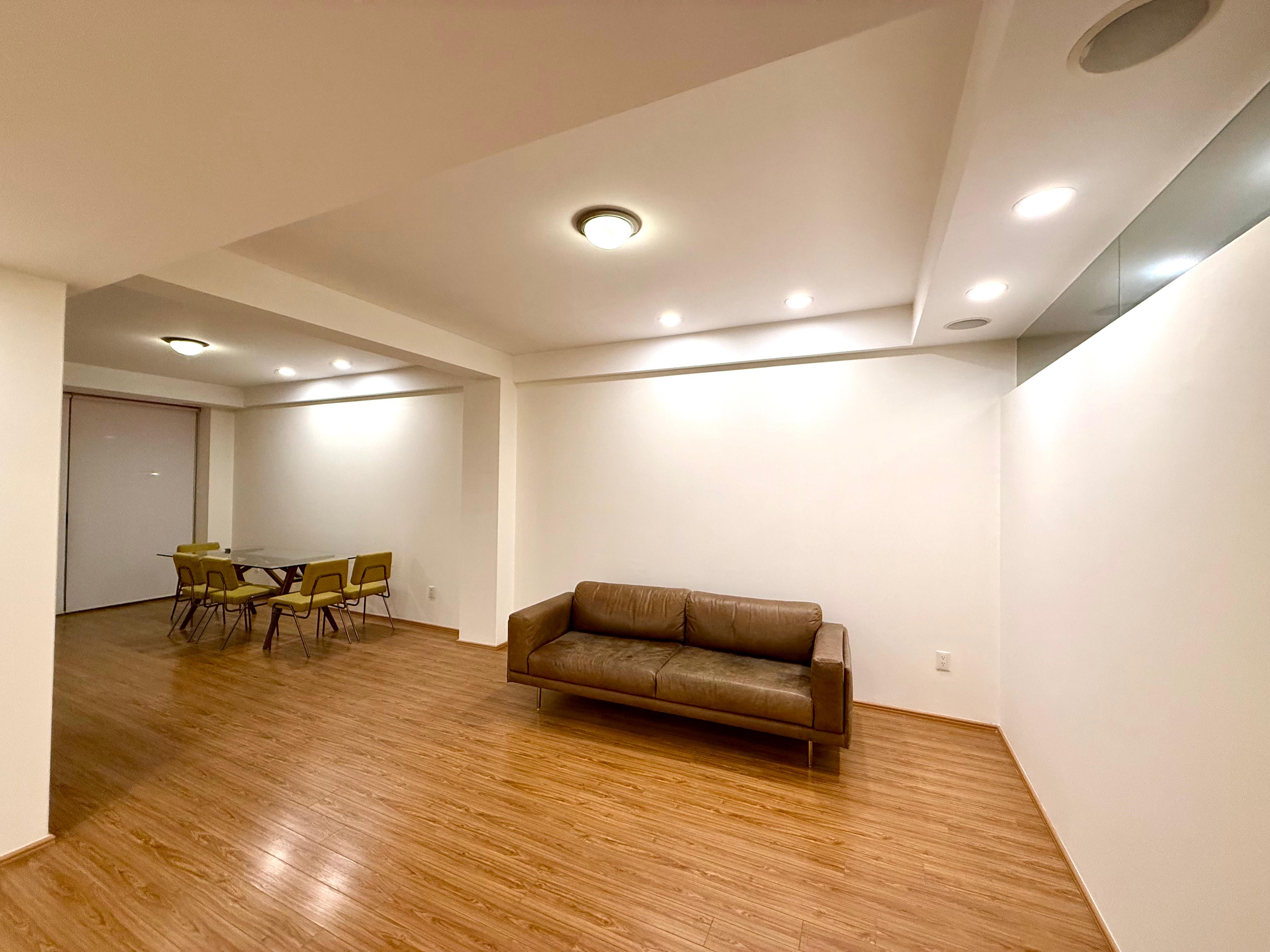 Al ingresar al departamento una muy amplia sala comedor, cocina integral con una barra desayunadora que conecta al área social con la cocina, espacio para family room, closet de blancos, baño completo que da servicio a la recamara secundaria y al área social.
