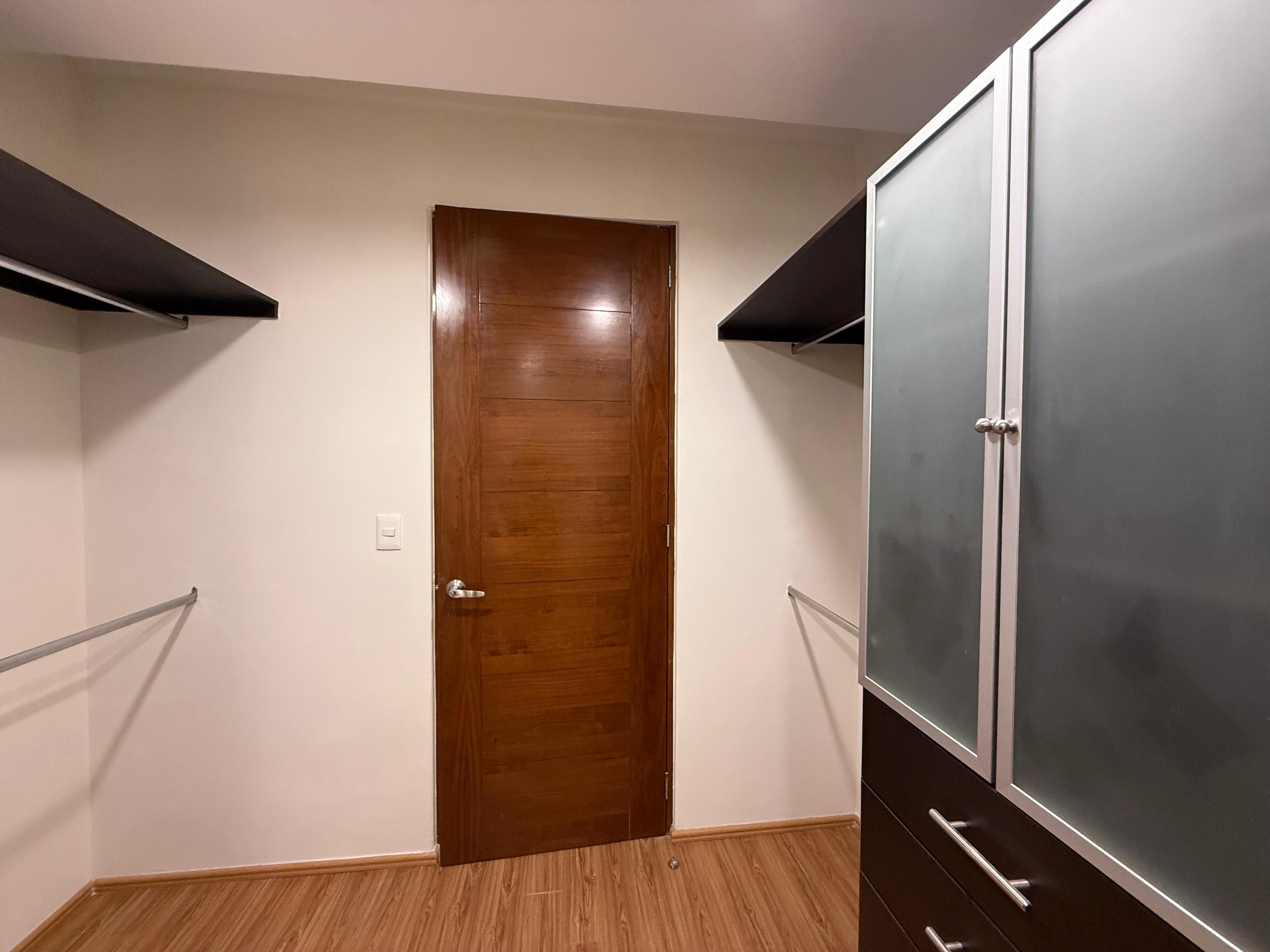 Recámara secundaria con clóset, recámara principal con vestidor, baño completo, y salida a un balcón.