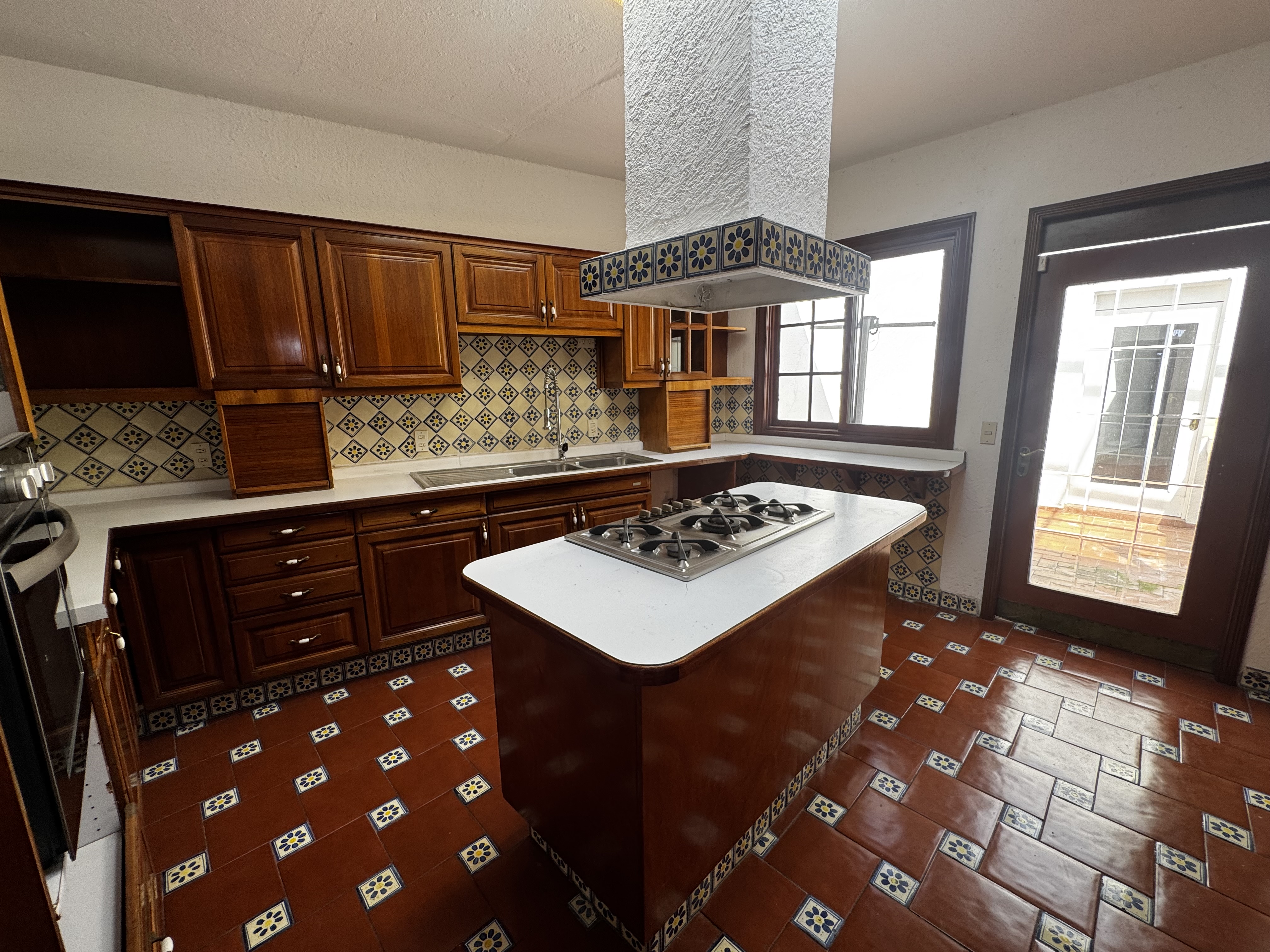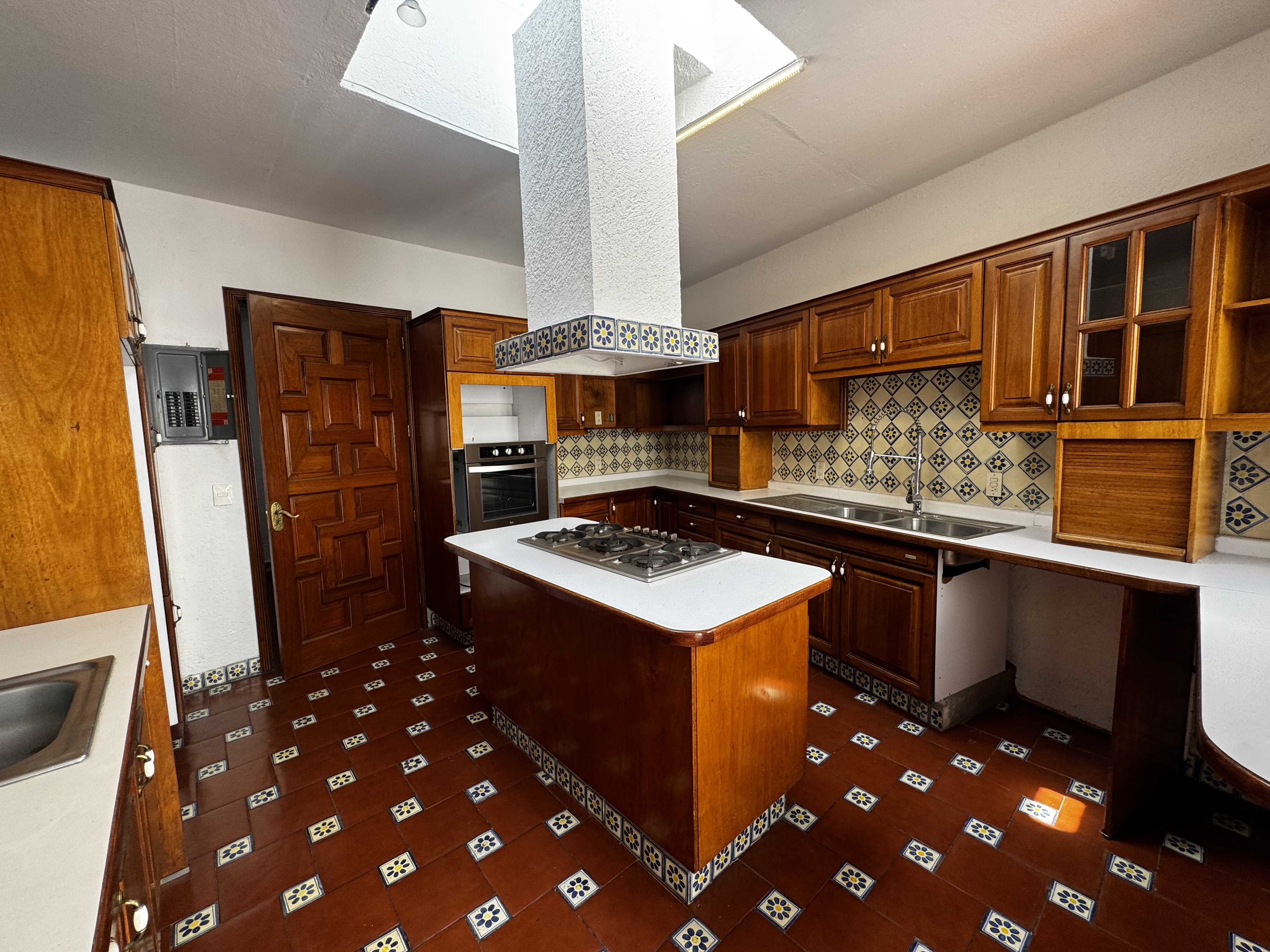 Cocina equipada con horno, estufa y campana con doble entrada.