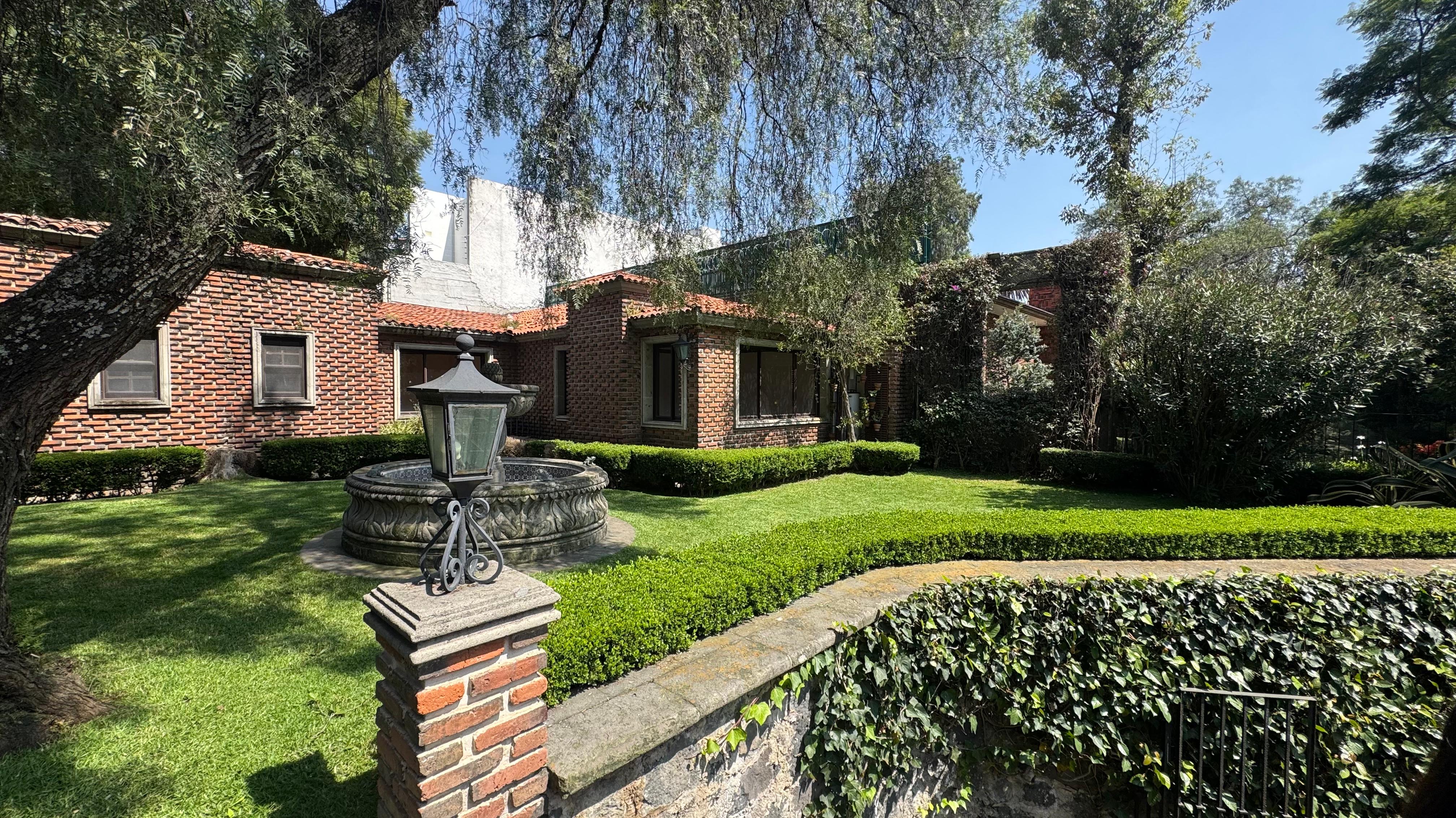 Amplio jardín con fuente de cantera.