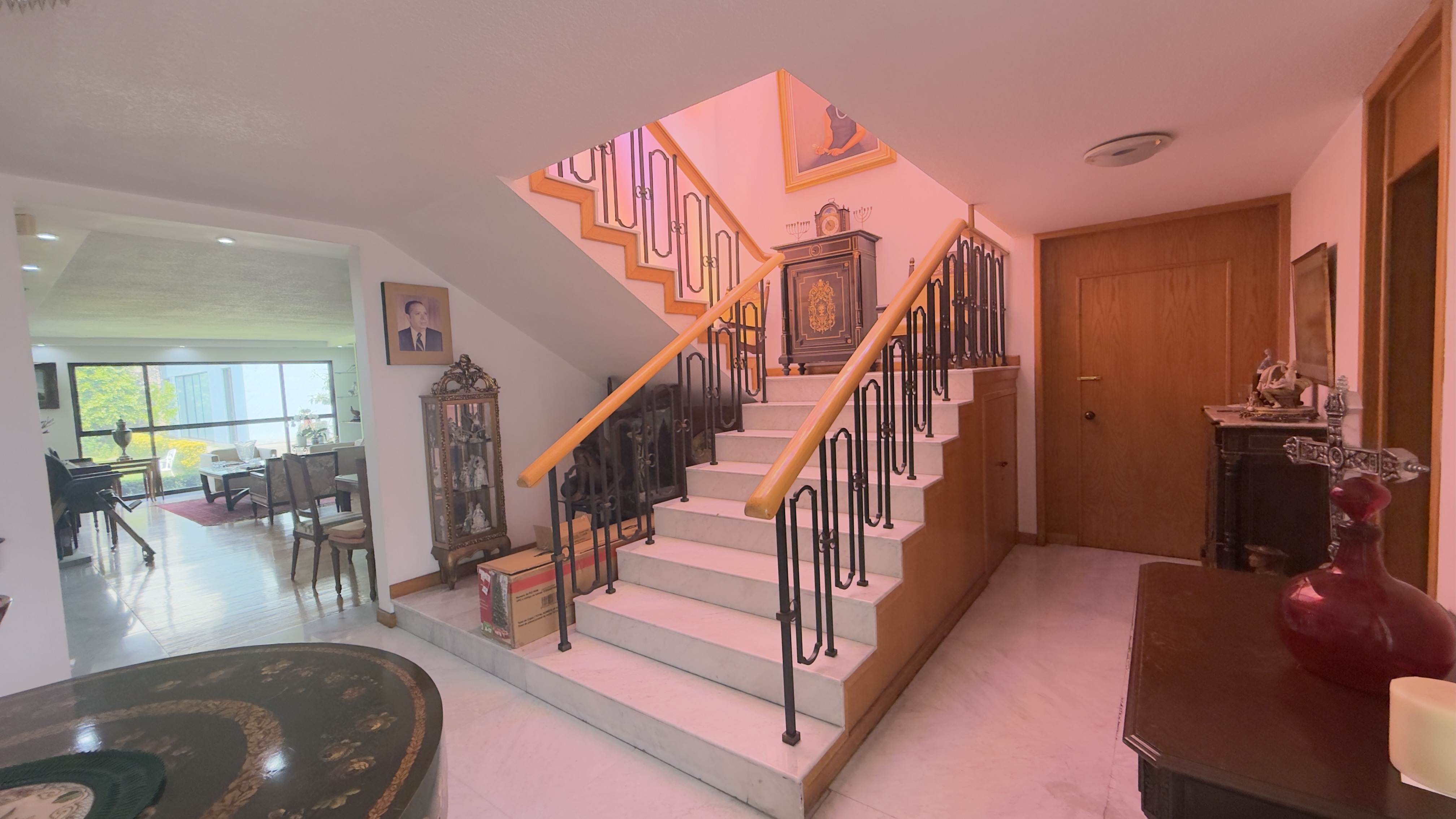 Amplio recibidor muy iluminado con techos de mediana altura.